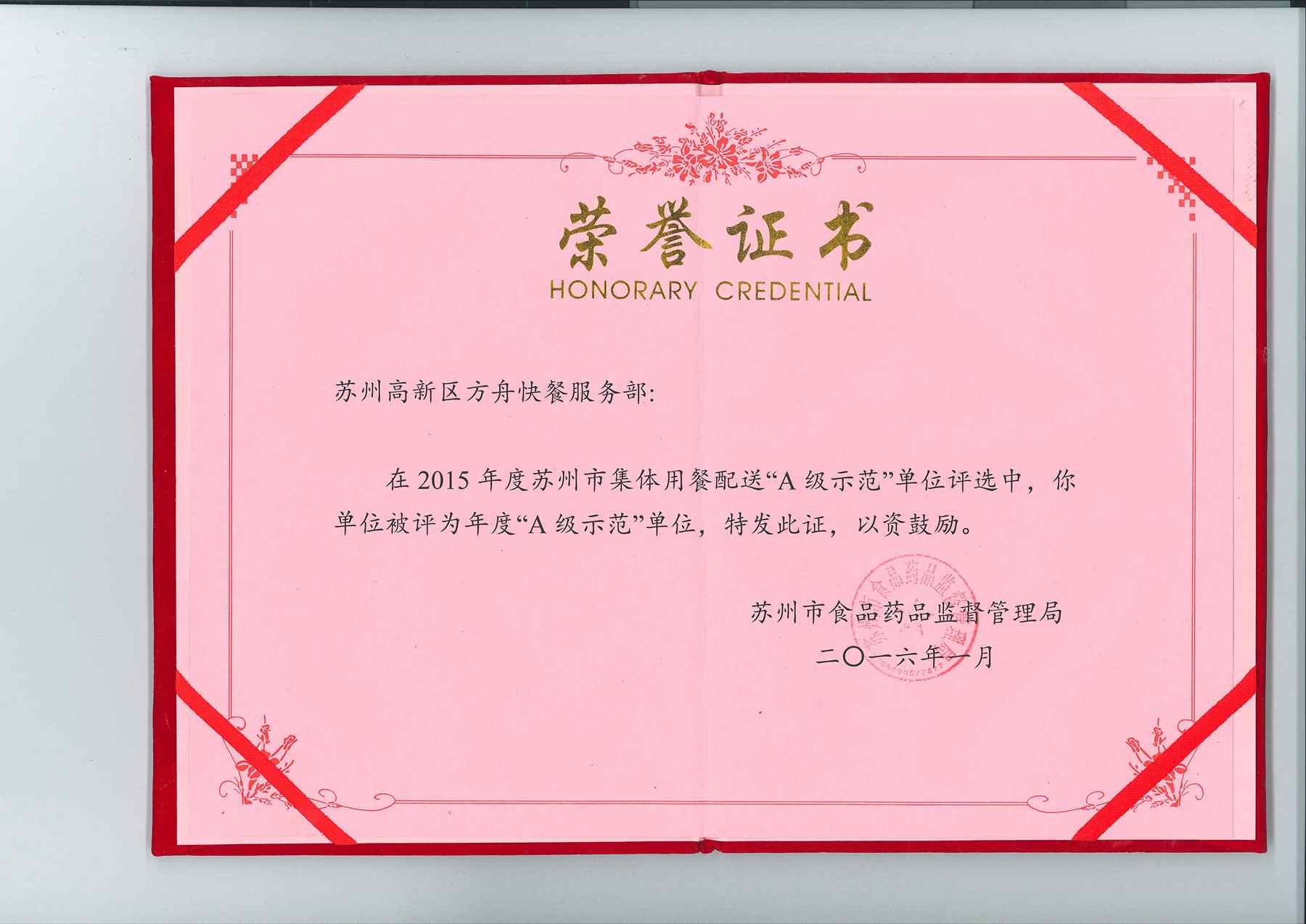 方舟快餐A級(jí)示范證書